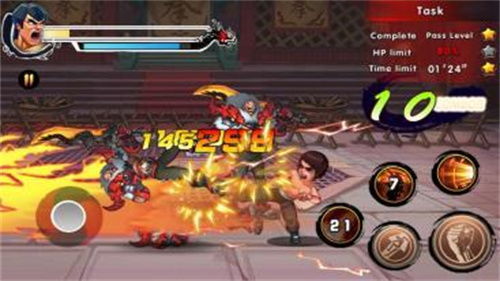 功夫王游戏采用了经典的横版卷轴式玩法,玩家需要通过不断击败敌人,解锁新的关卡。游戏中的挑战丰富多样,包括: